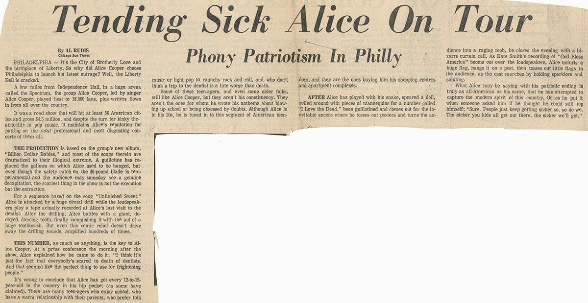 It was a road show that will hit at least 56 American cities and gross $4.5 million, and despite the turn for kinky theatricality in pop music, it maintains Alice's reputation for putting on the most professional and most disgusting concerts of them all.