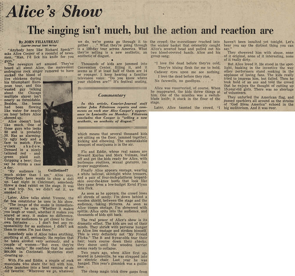 "My audience is much sicker than I am," Alice says. "Everybody here wants to chop a doll up. Last night in Cincinnati, somebody threw a dead rabbit on the stage. It was a real trip. No, we didn't eat it, we smoked it."