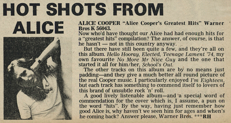 Now who'd have thought our Alice had had enough hits for a "greatest hits" compilation? The answer, of course, is that he hasn't — not in this country anyway.