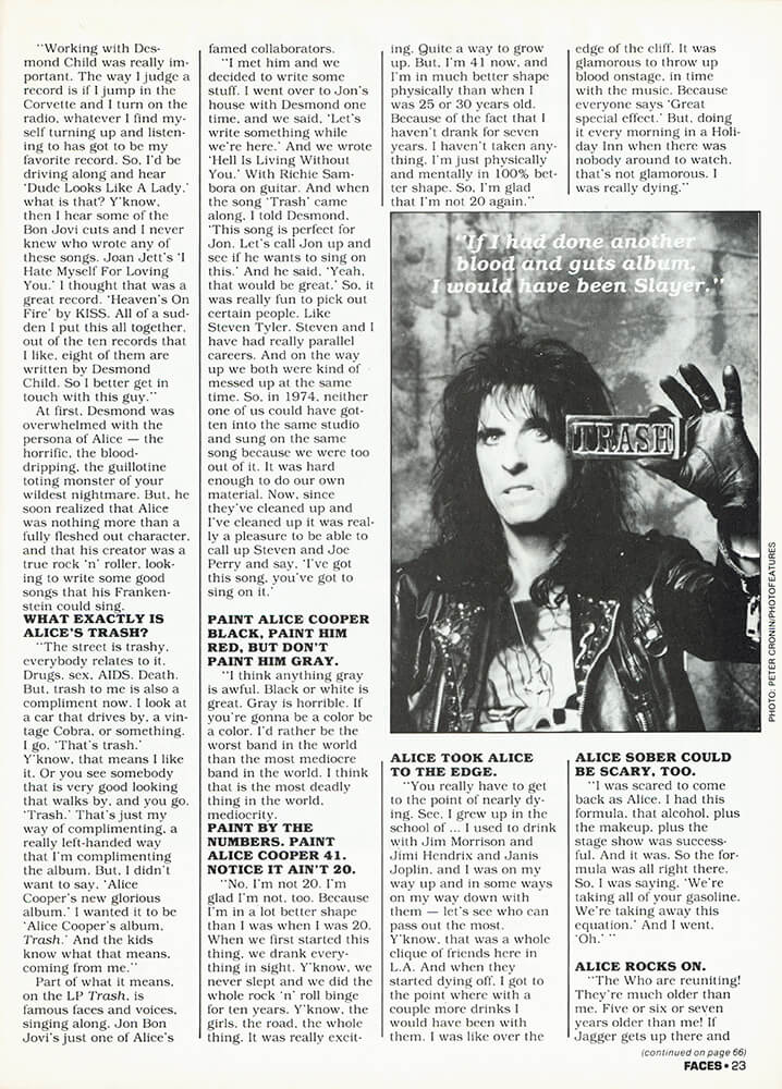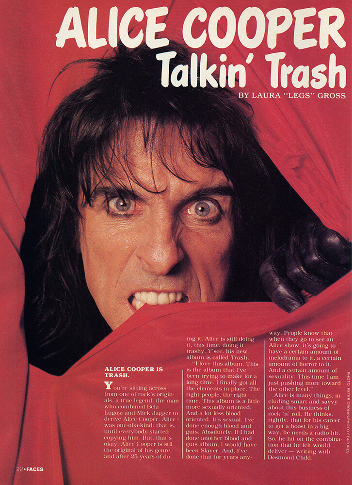 You're sitting across from one of rock's originals, a true legend, the man who combined Bela Lugosi and Mick Jagger to derive Alice Cooper. Alice was one-of-a-kind: that is, until everybody started copying him. But, that's okay, Alice Cooper is still the original of his genre, and after 25 years of doing it, Alice is still doing it, this time, doing it trashy. Y'see, his new album is called Trash.