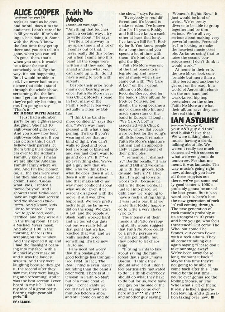 "I love this album. This is the album that I've been trying to make for a long time, I finally got all the elements in place. The right people, the right time. This album is a little more sexually orientated. And a lot less blood orientated. It's sexual. I've done enough blood and guts. Absolutely. If I had done another blood and guts album, I would have been Slayer. And, I've done that for years anyway. People know that when they go to see an Alice show, it's going to have a certain amount of melodrama to it, a certain amount of horror to it. And a certain amount of sexuality. This time I am just pushing more towards the other level."