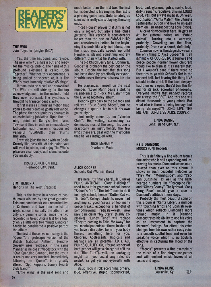 Come on now, is the stage show really the only thing to Alice Cooper? Is it all gimmick? OF COURSE NOT! You love and peace people (formerly flower children) would like to dismiss it as merely that. But I wouldn't care if there were no theatrics to go with School's Out in the concert hall. Just hearing this thing LIVE should incite a riot. If the local deejays had their ears open, they'd ban this thing for its sick, screwball philosophy. Everyone knows that banned records are always the BEST. And this one will distort thousands of young minds. But what else is there to being teenage but being deranged???? - LONG LIVE THE MUTANT! LONG LIVE ALICE COOPER!