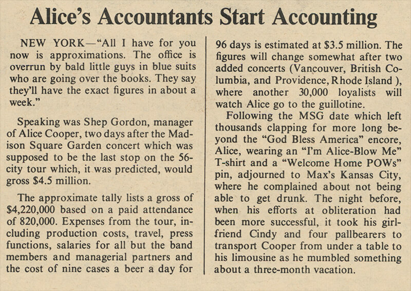 The approximate tally lists a gross of $4,220,000 based on a paid attendence of 820,000. Expenses from the tour, including production costs, travel, press functions, salaries for all but the band members and managerial partners and cost of nine cases of beer a day for 96 days is estimated at $3.5 million. The figures will change somewhat after two added concerts (Vancouver, British Columbia, and Providence, Rhode Island), where another 30,000 loyalists will watch Alice go to the guillotine.