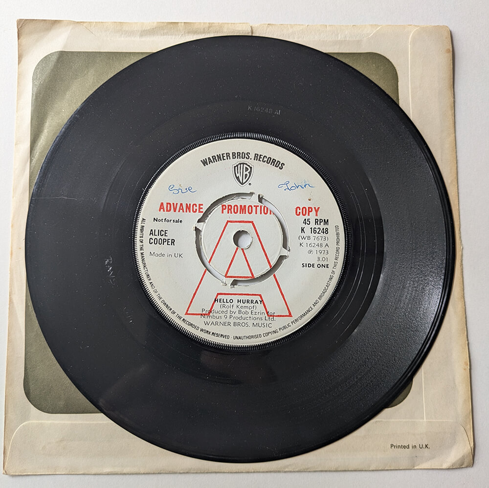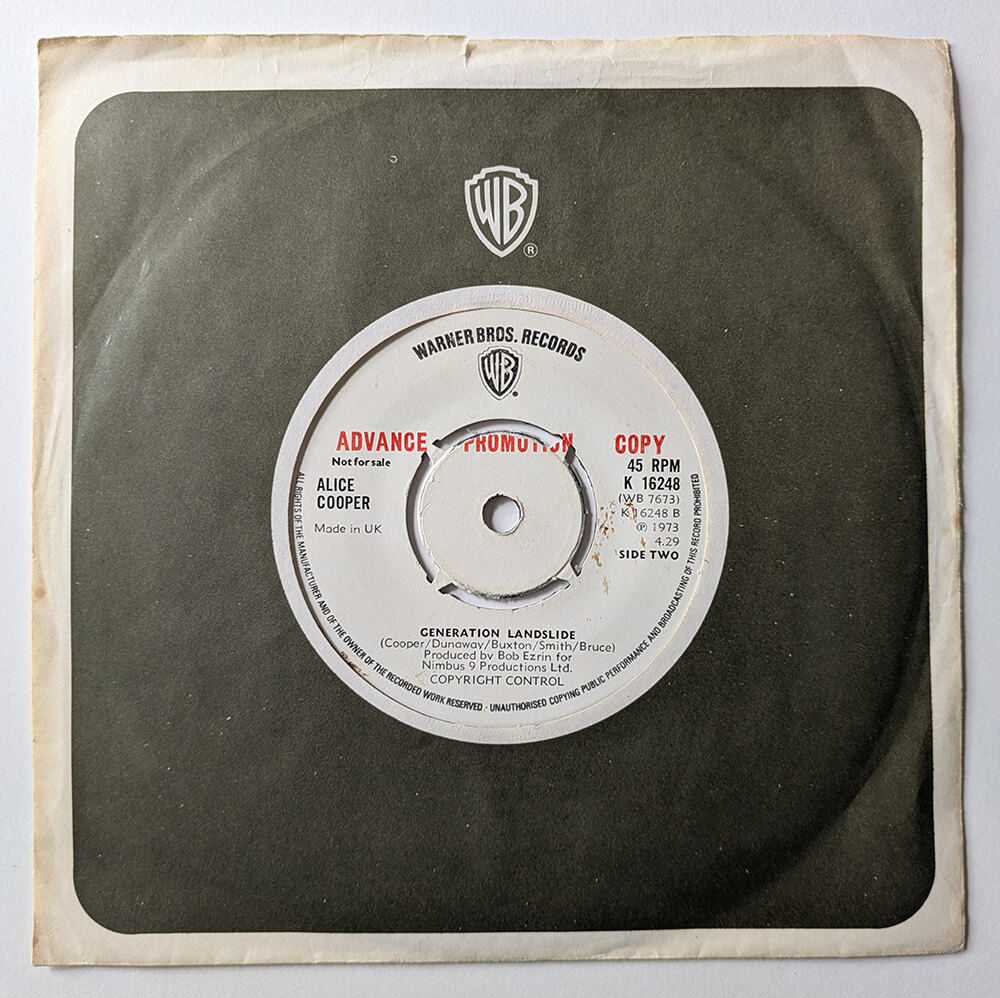 School's Out b/w School's Out (Live from Alice Cooper Show) -- 7" US Promotional single. Warner Brothers, WBS 8607. 1977