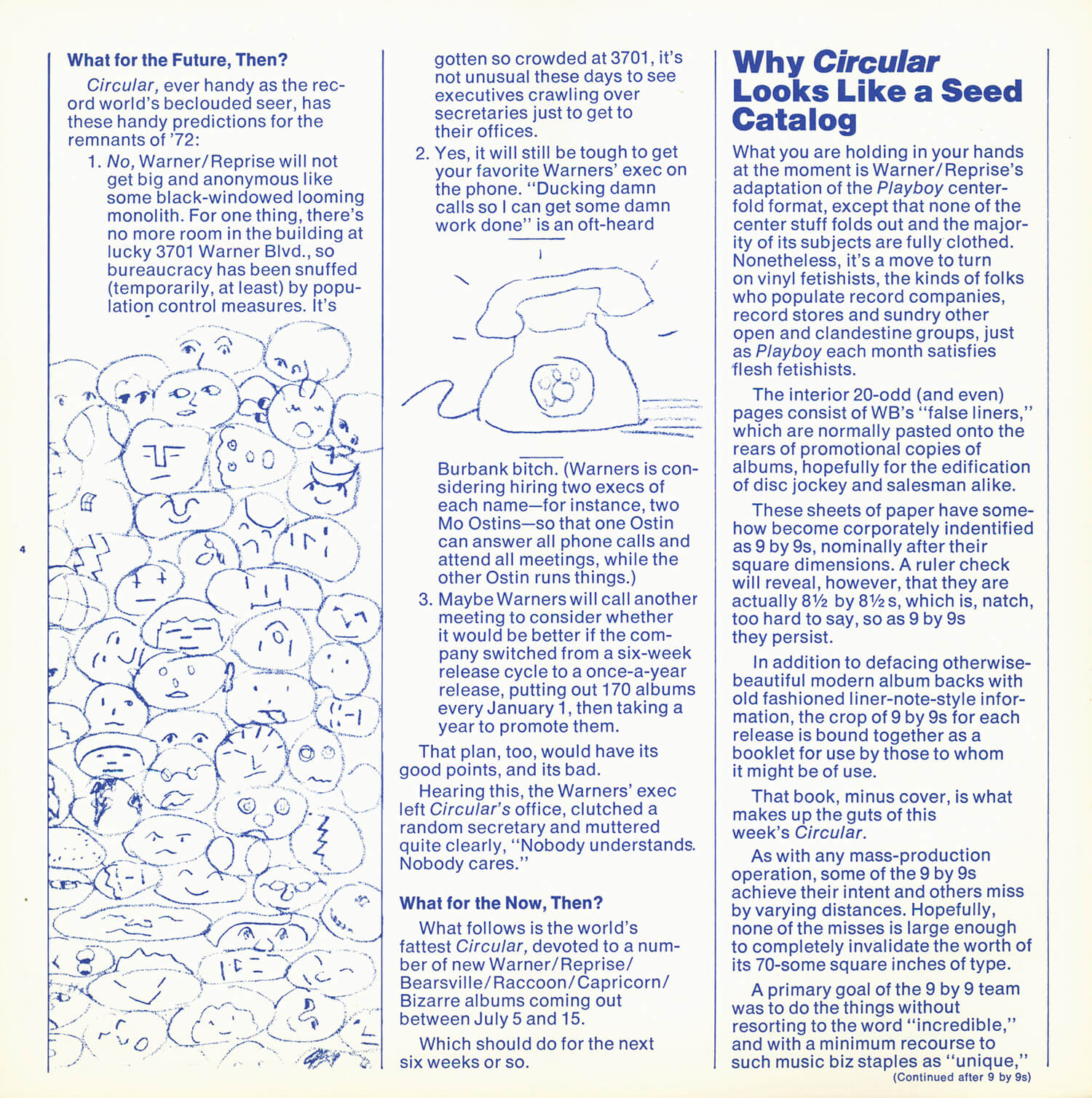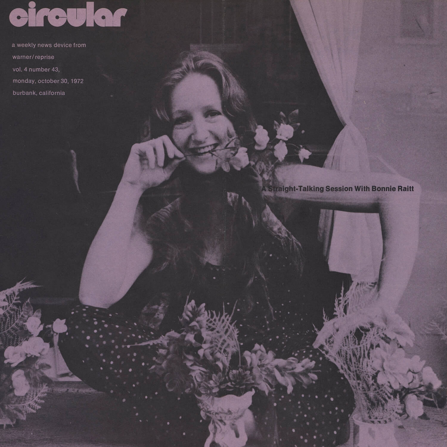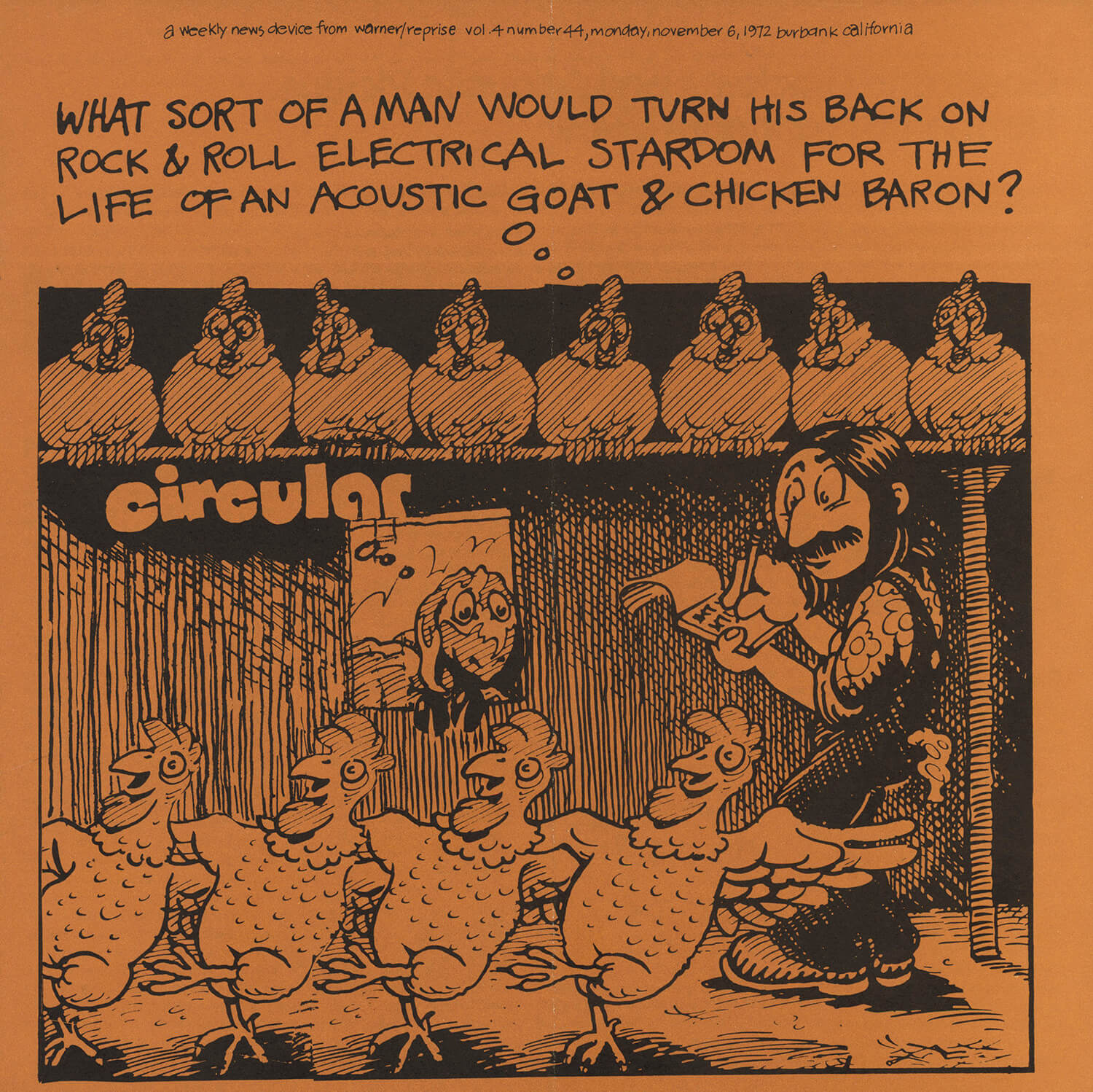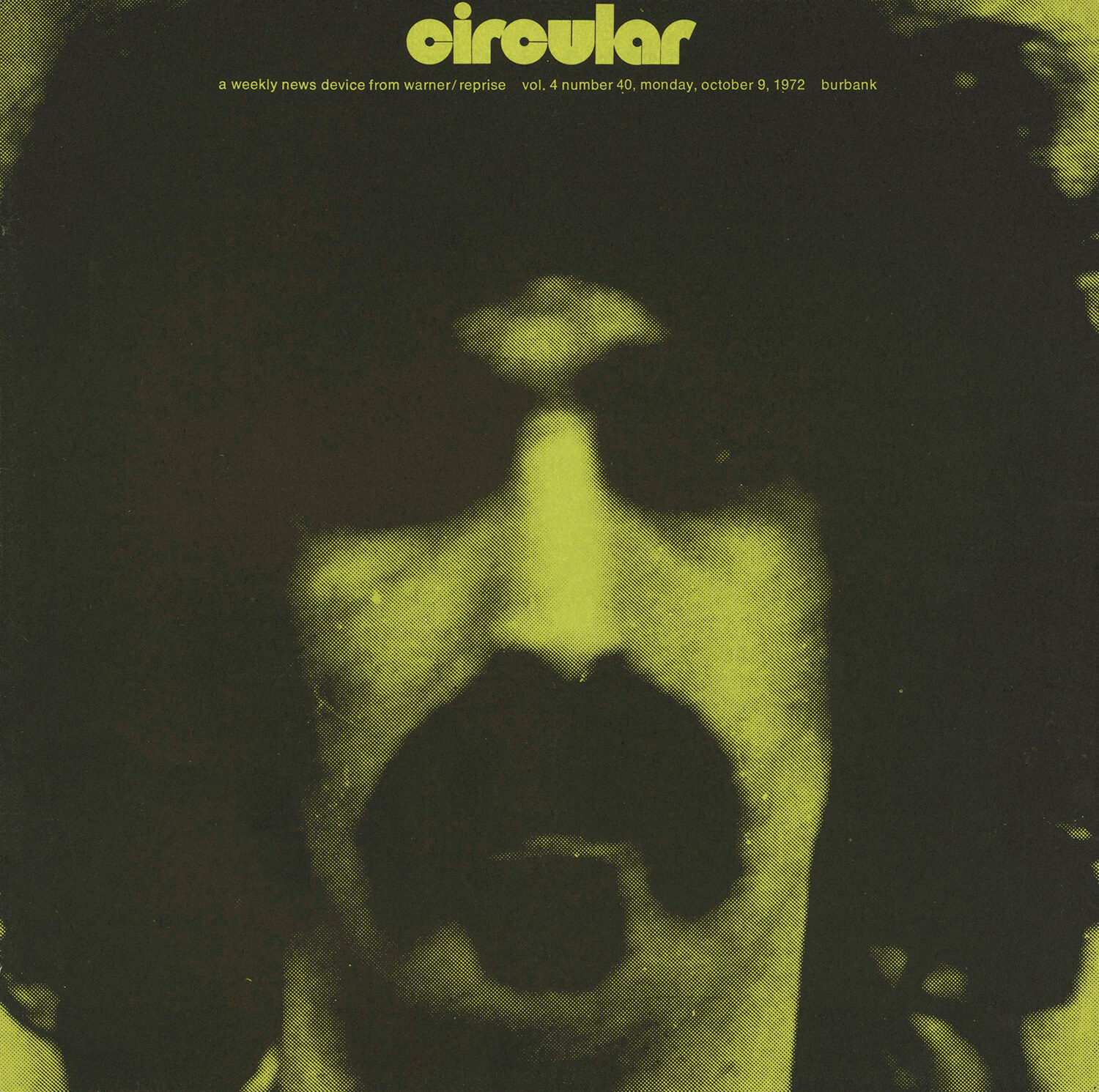 Tagged as "A Weekly News Device from Warner/Reprise" this promotional magazine ran from late 1969 until 1975. It began as a tri-folded booklet and then shifted to a square 8 1/2" magazine format. It was often mailed out folded so it's normal to find these with a crease down the center in its square form. The magazine had features and news on the artists signed to Warner/Reprise and the music industry in general, as well as album and singles commentary and sales information.