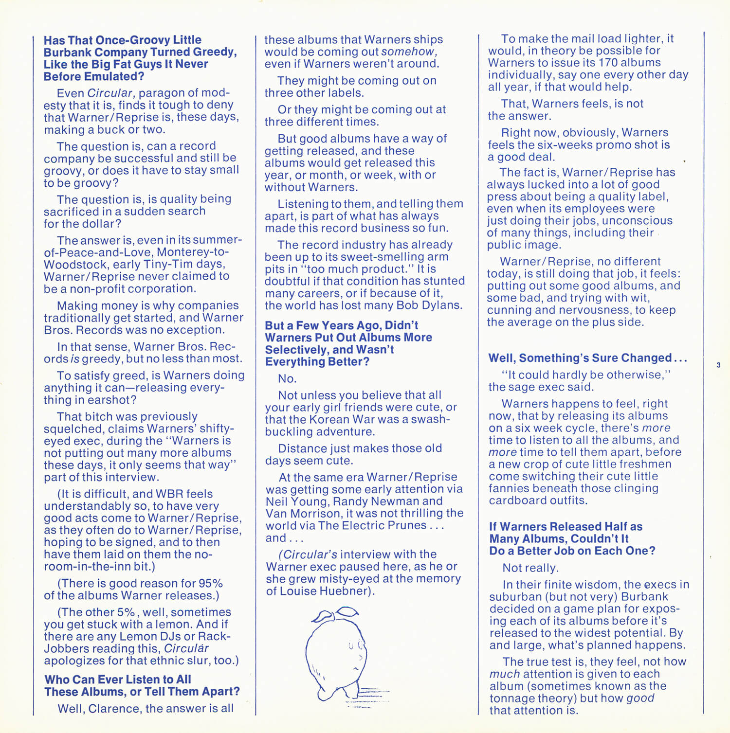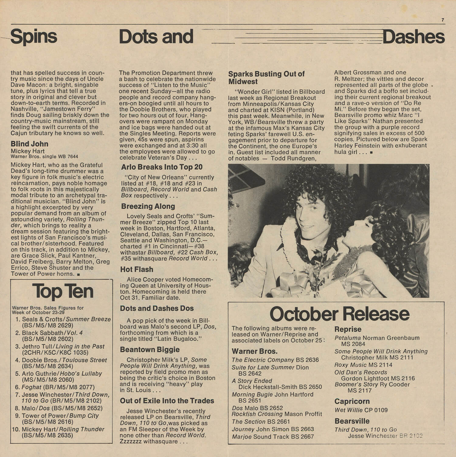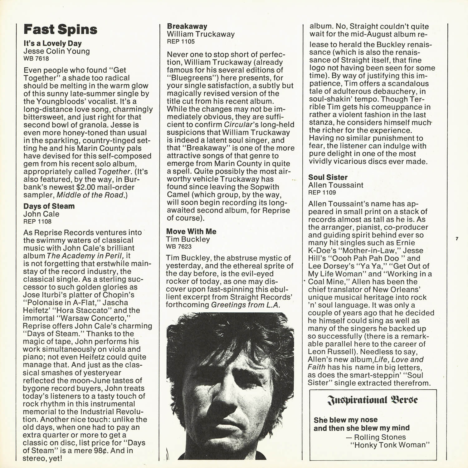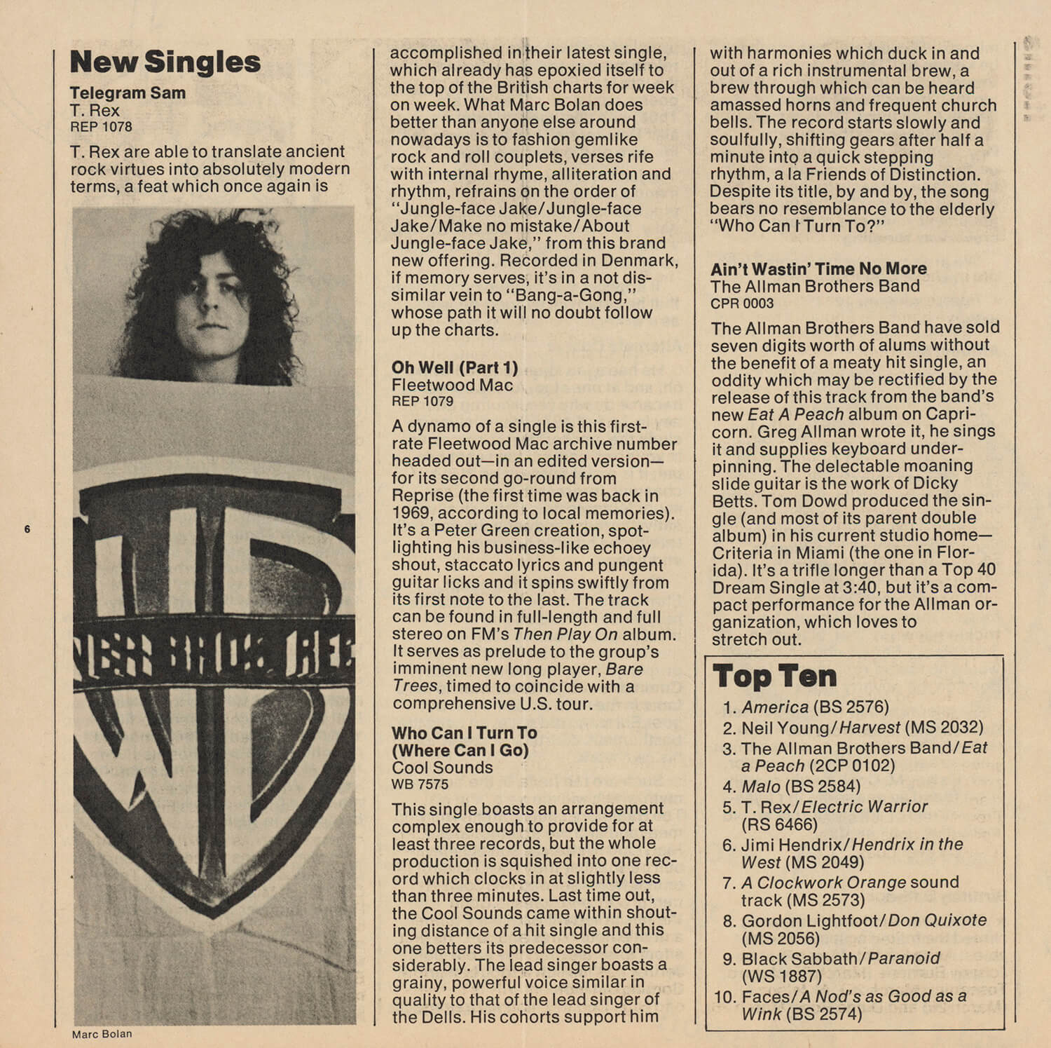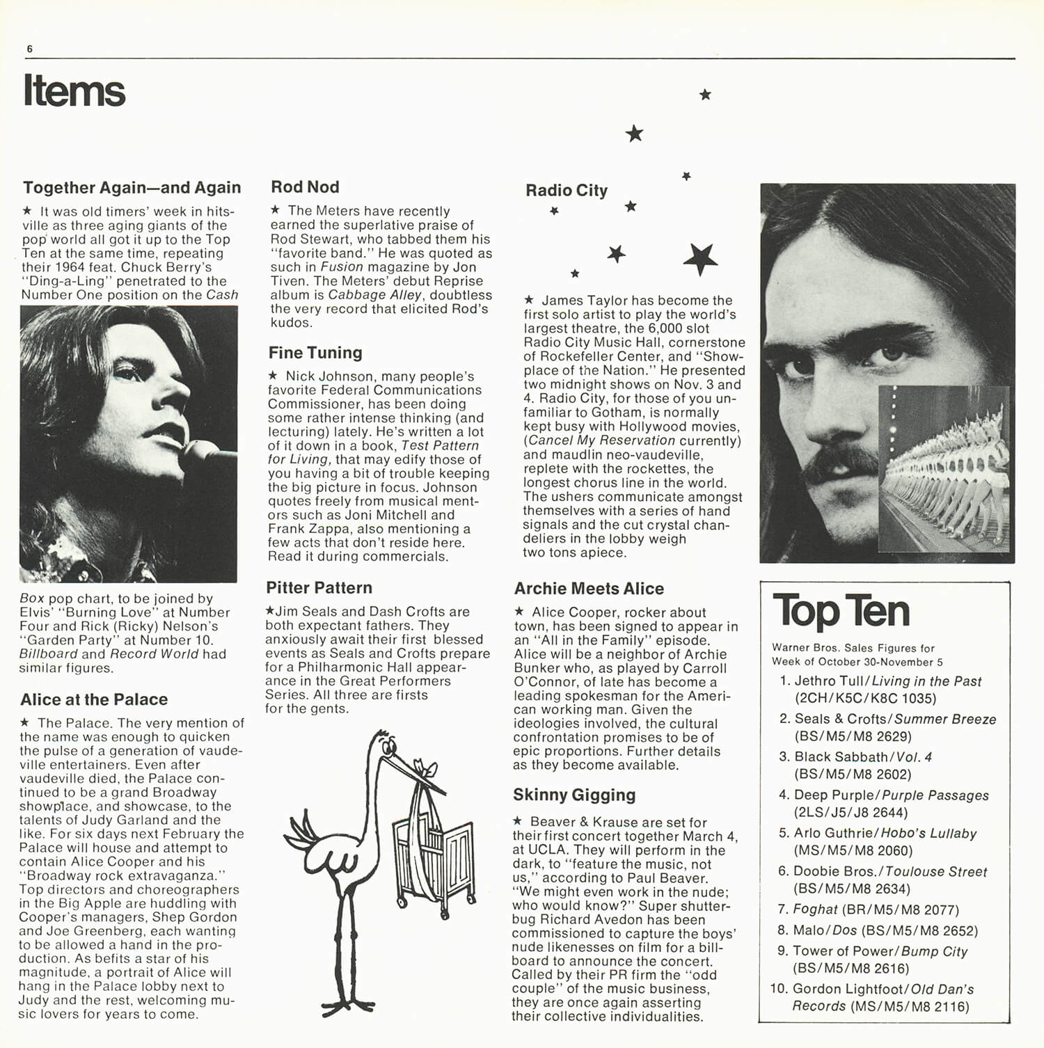 Tagged as "A Weekly News Device from Warner/Reprise" this promotional magazine ran from late 1969 until 1975. It began as a tri-folded booklet and then shifted to a square 8 1/2" magazine format. It was often mailed out folded so it's normal to find these with a crease down the center in its square form. The magazine had features and news on the artists signed to Warner/Reprise and the music industry in general, as well as album and singles commentary and sales information.