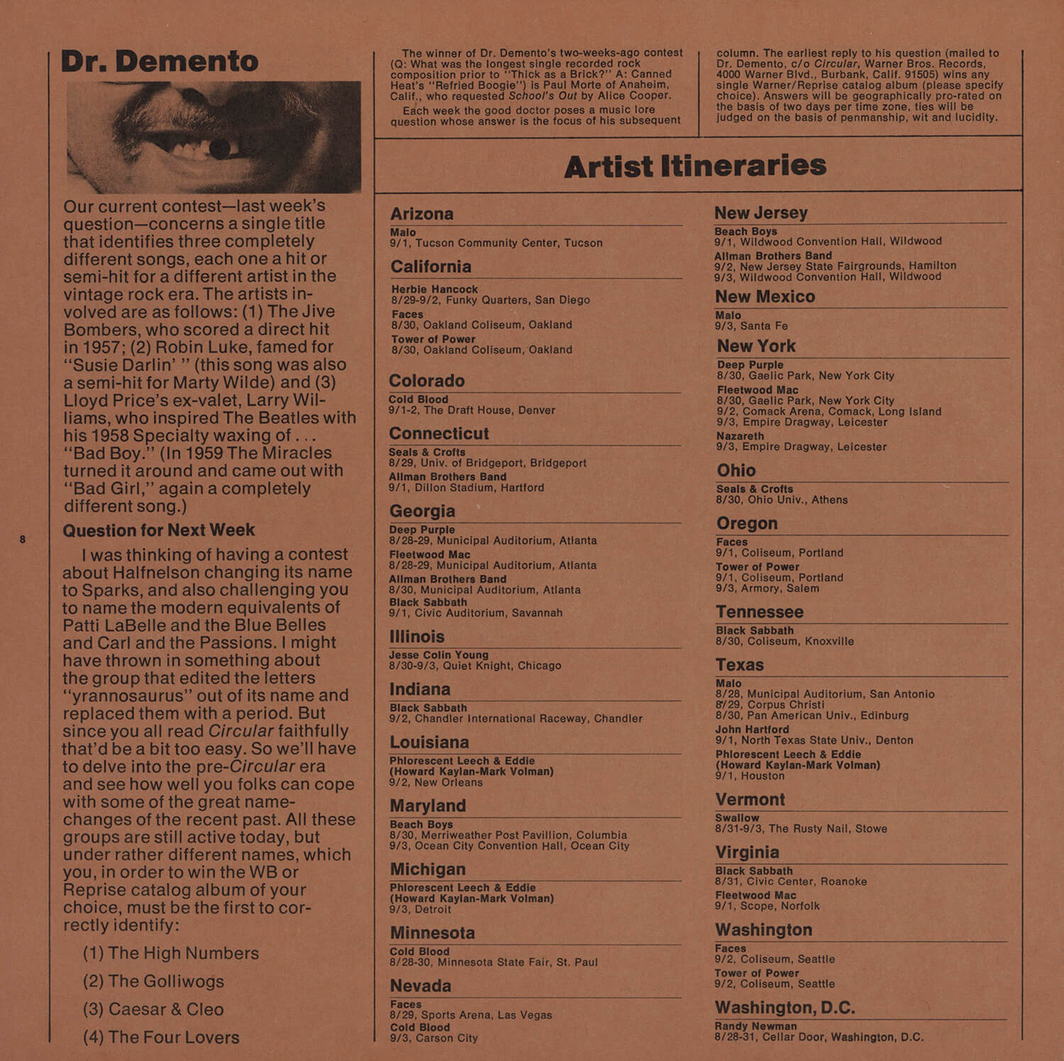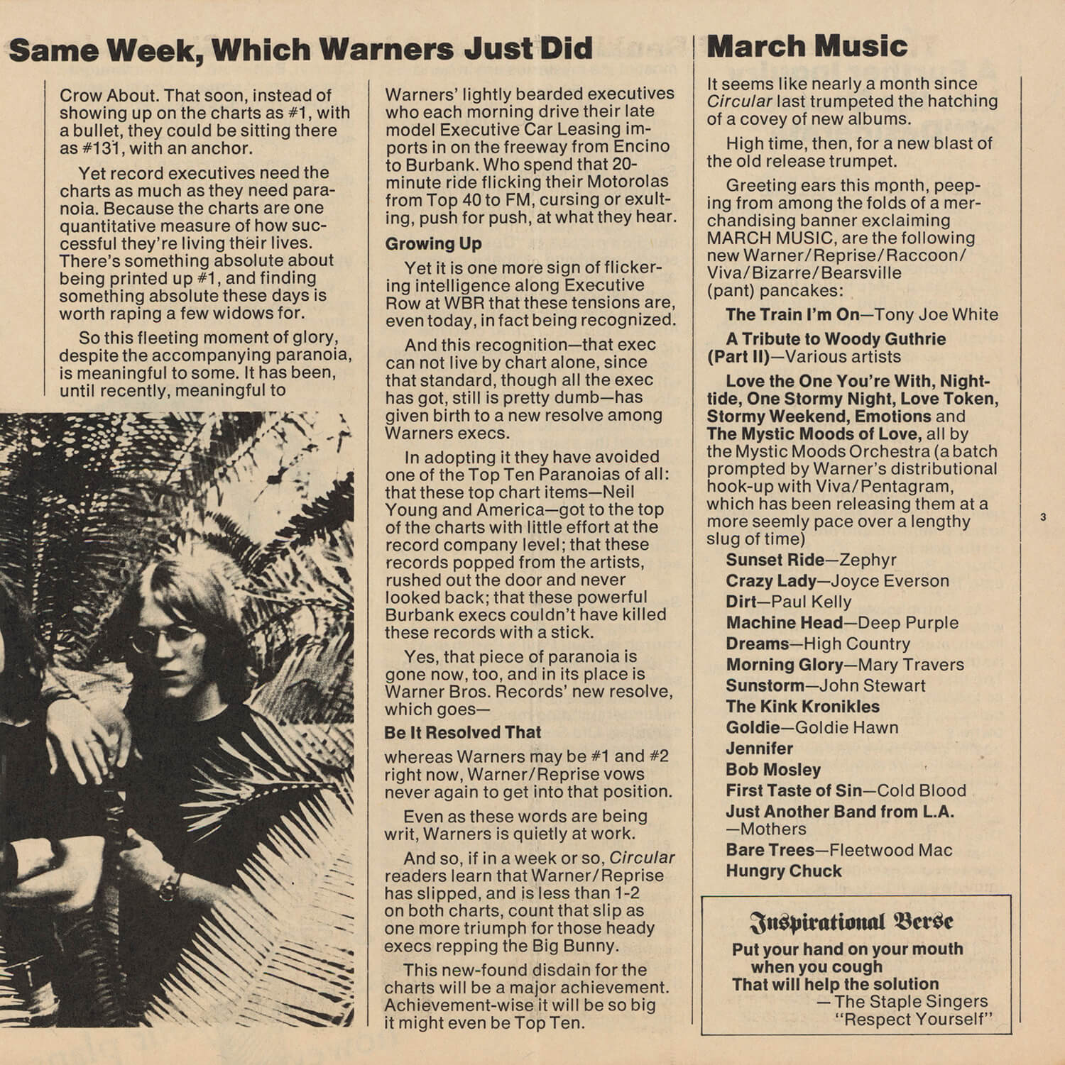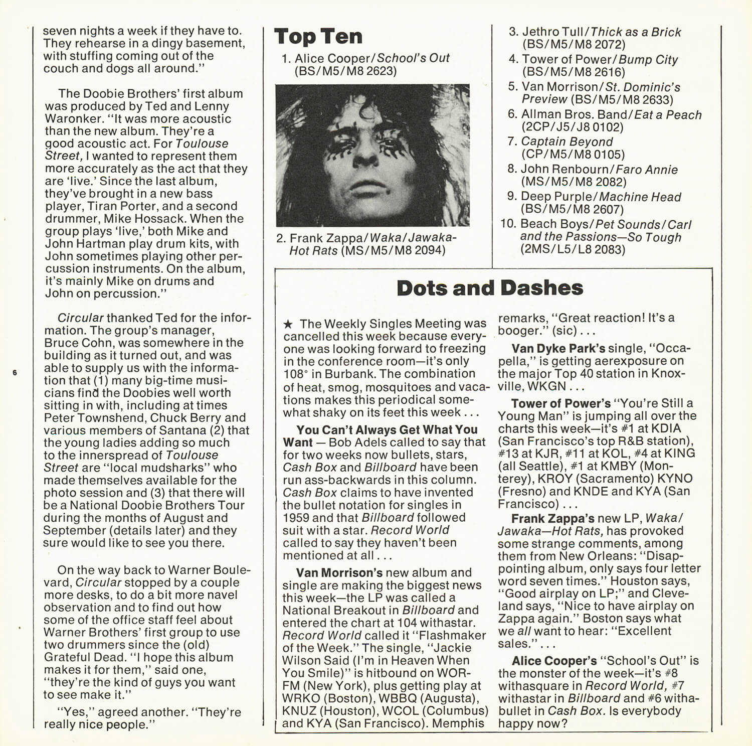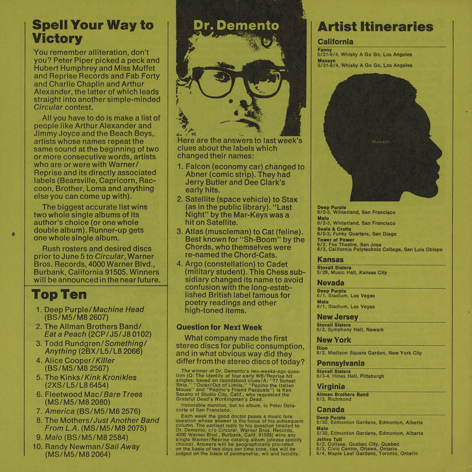 Tagged as "A Weekly News Device from Warner/Reprise" this promotional magazine ran from late 1969 until 1975. It began as a tri-folded booklet and then shifted to a square 8 1/2" magazine format. It was often mailed out folded so it's normal to find these with a crease down the center in its square form. The magazine had features and news on the artists signed to Warner/Reprise and the music industry in general, as well as album and singles commentary and sales information.