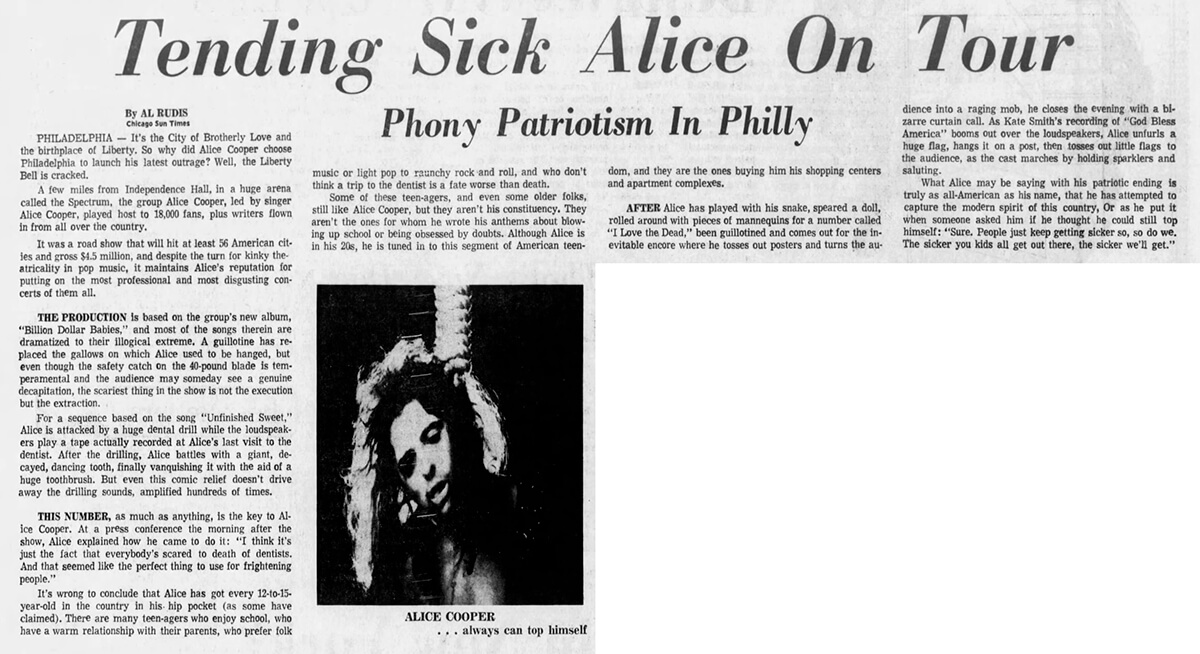 It was a road show that will hit at least 56 American cities and gross $4.5 million, and despite the turn for kinky theatricality in pop music, it maintains Alice's reputation for putting on the most professional and most disgusting concerts of them all.