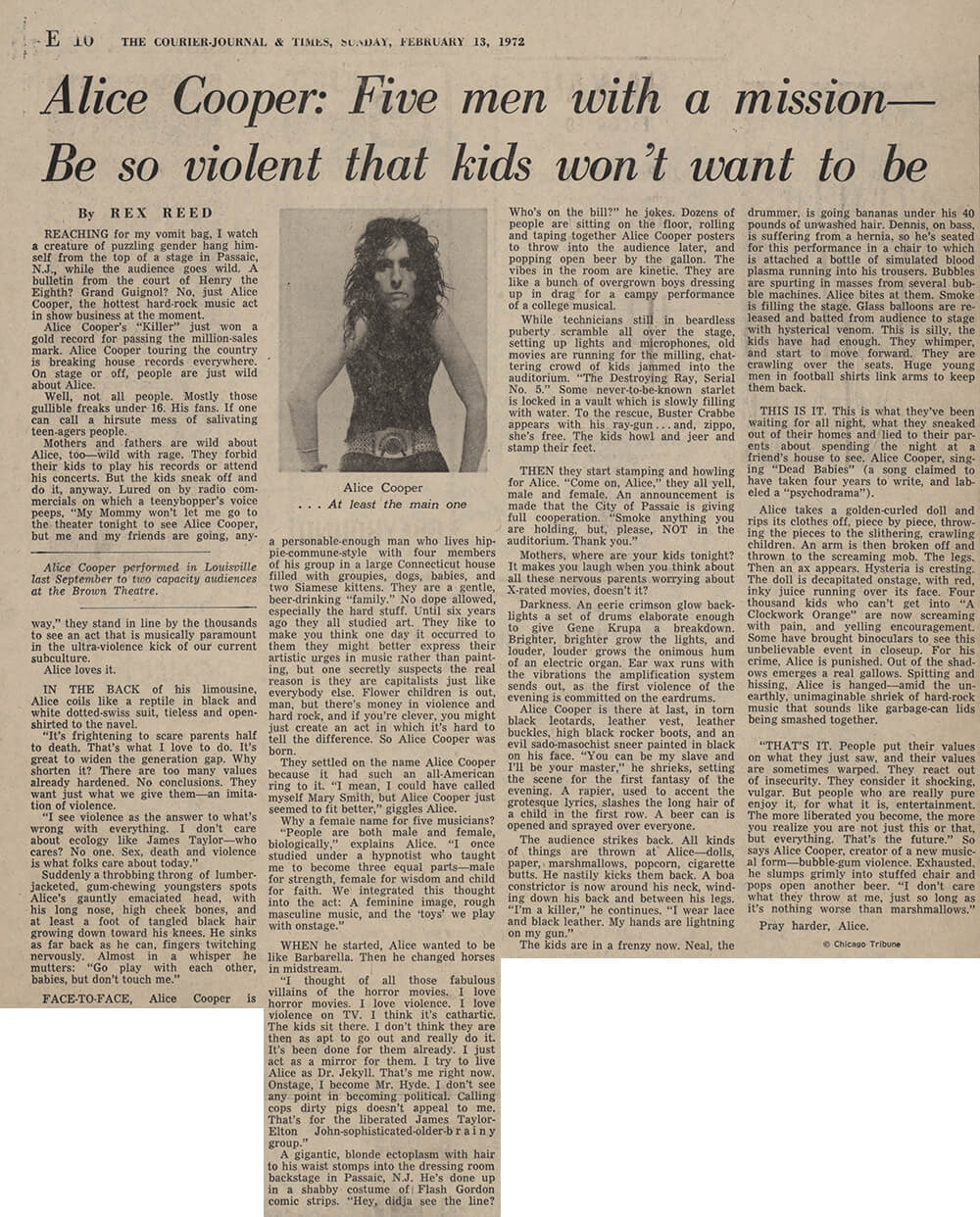 Mothers and fathers are wild about Alice, too — wild with rage. They forbid their kids to play his records or attend his concerts. But the kids sneak off and do it, anyway. Lured on by radio commercials on which a teenybopper's voice peeps, "My Mommy won't let me go to the theater tonight to see Alice Cooper, but me and my friends are going, anyway," they stand in line by the thousands to see an act that is musically paramount in the ultra-violence kick of our current subculture.