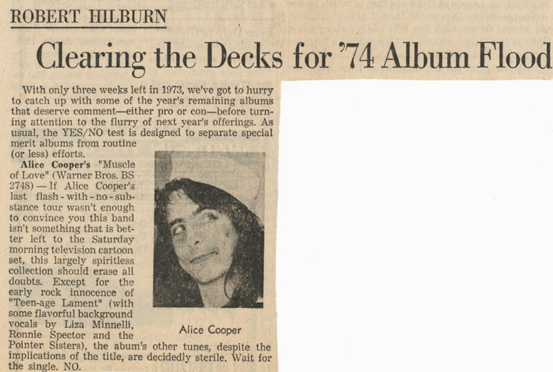 Alice Cooper's "Muscle of Love" (Warner Bros. BS 2748) — If Alice Cooper's last flash-with-no-substance tour wasn't enough to convince you this band isn't something that is better left to the Saturday morning television cartoon set, this largely spiritless collection should erase all doubts. Except for the early rock innocence of "Teenage Lament" (with some flavorful background vocals by Liza Minnelli, Ronnie Spector and the Pointer Sisters), the album's other tunes, despite the implications of the title, are decidedly sterile. Wait for the single. NO.